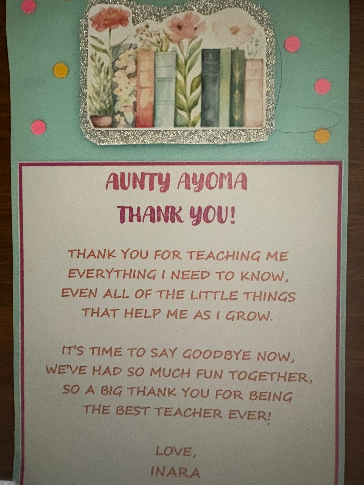 AUNTY AYOMA THANK YOU! THANK YOU FOR TEACHING ME EVERYTHING I NEED TO KNOW, EVEN ALL OF THE LITTLE THINGS THAT HELP ME AS I GROW. IT’S TIME TO SAY .....